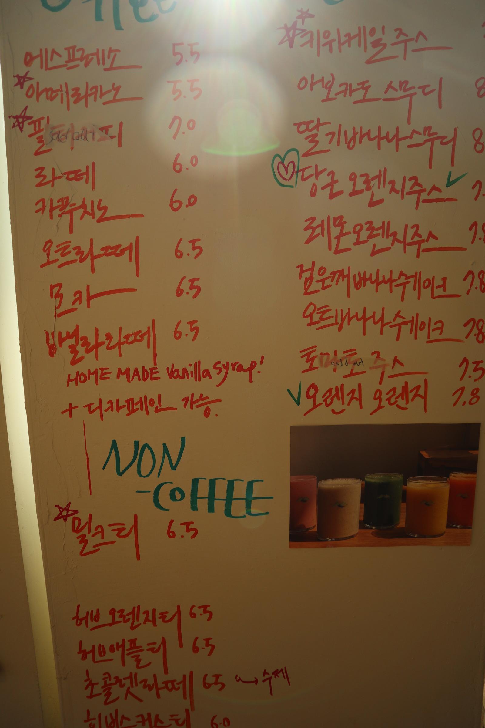 입구로 들어오시면, 왼편으로 메뉴판이 아주 크게 자리해서 보기 편하지만, 이날 역광이어서 그런지 눈에 잘 들어오진 않았어요!